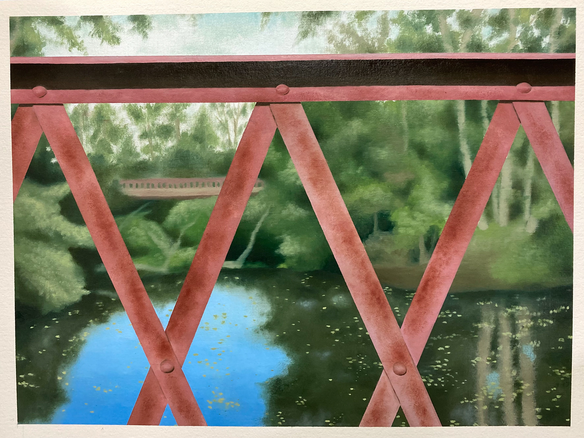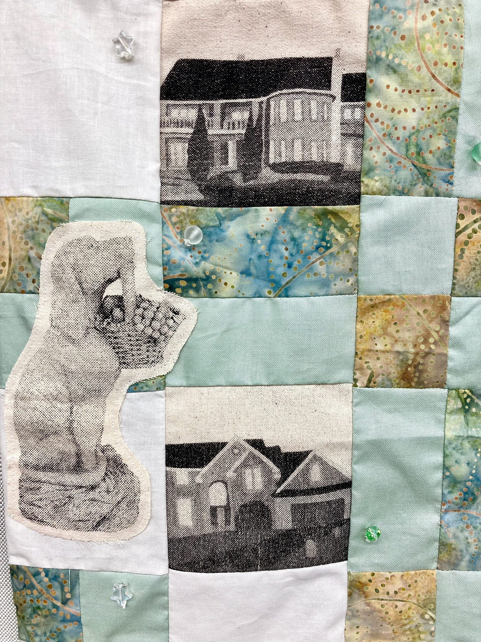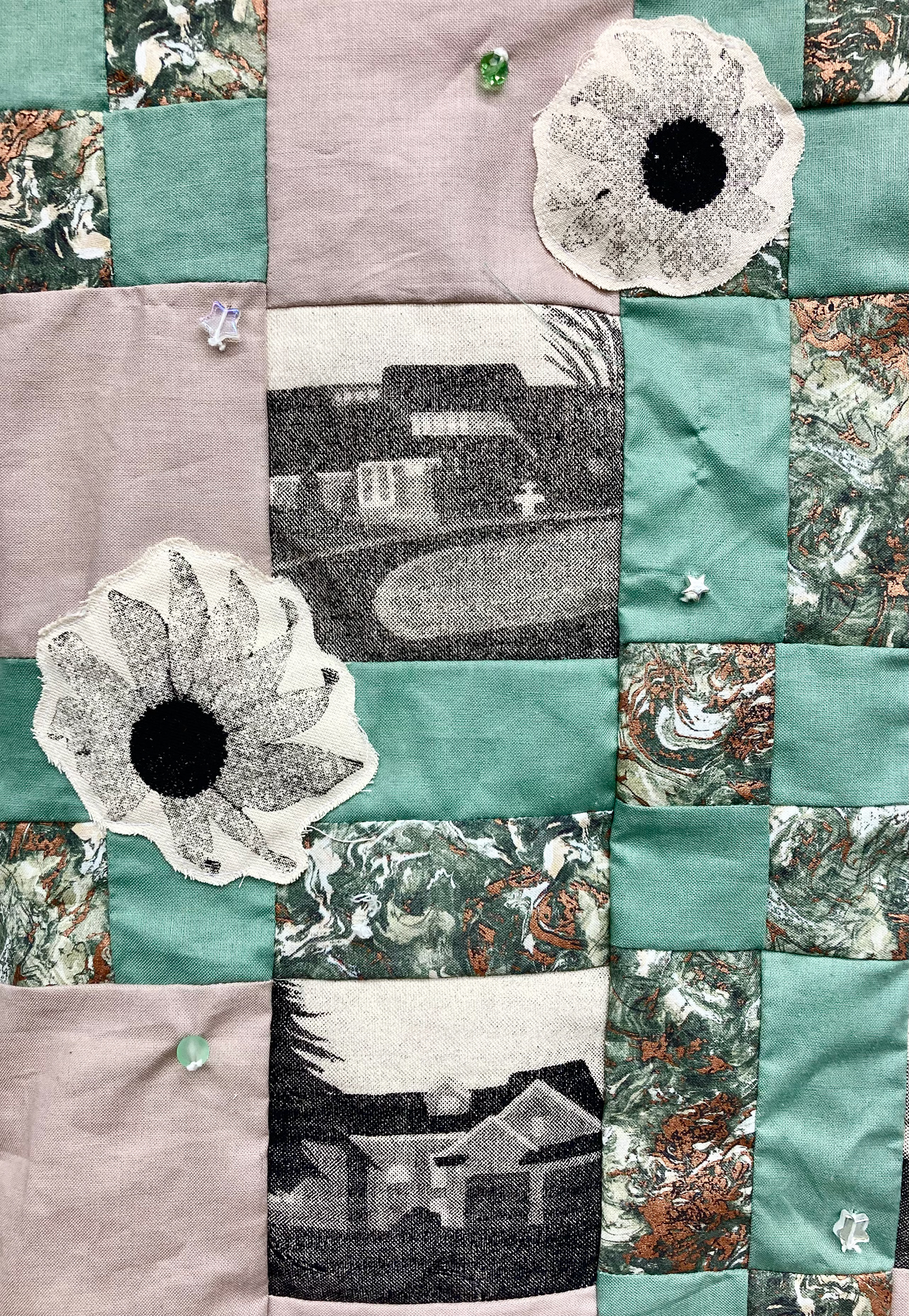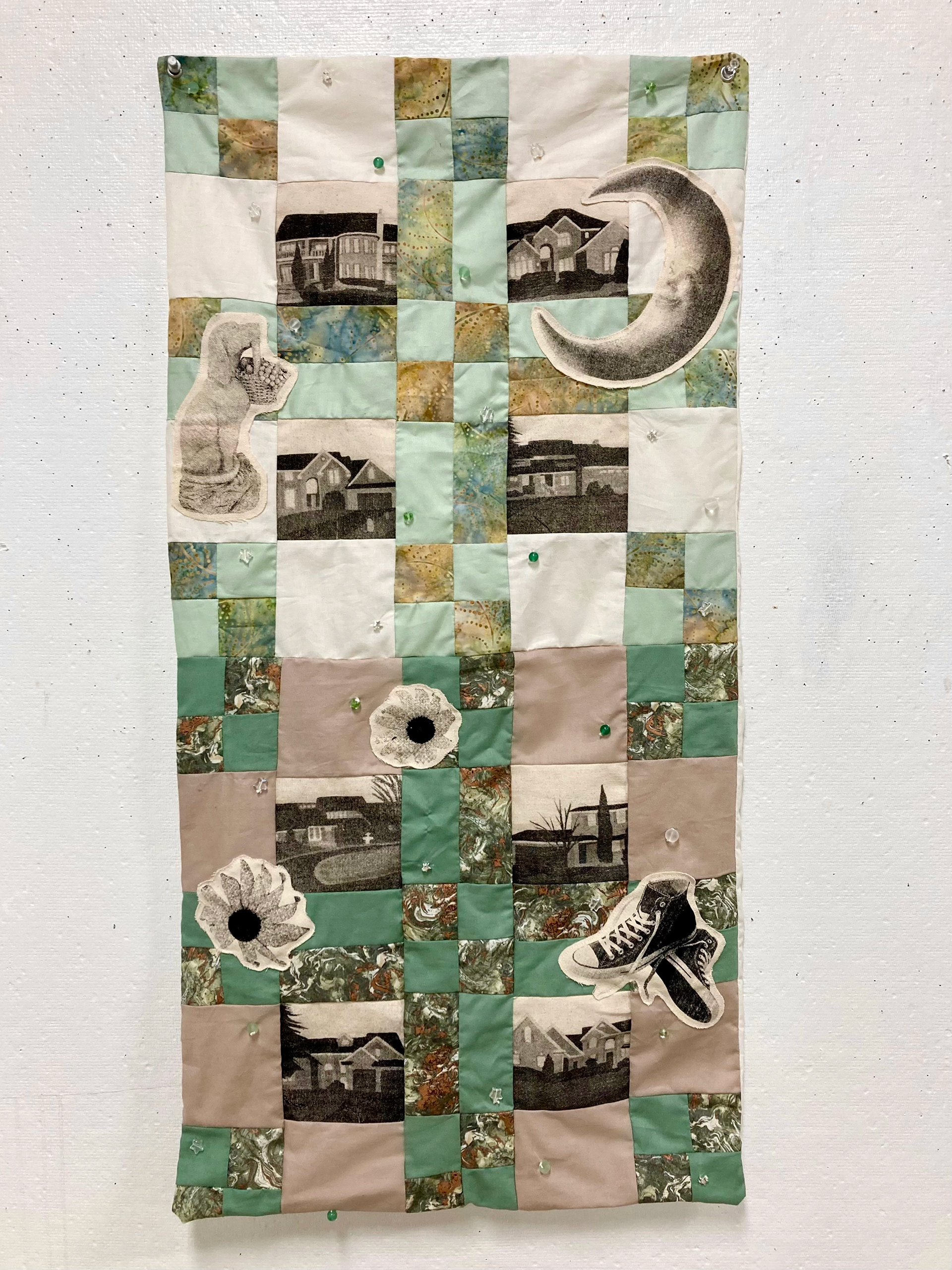 Photo motion halftone screen prints on canvas, stitched fabric, and beading. 15in x 36in